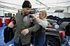 Petter Solberg får hjelp av kona og teamsjef Pernilla med polstringen som beskytter kragebeinet. (Foto: FIAWorldRallycross.com/Mcklein)